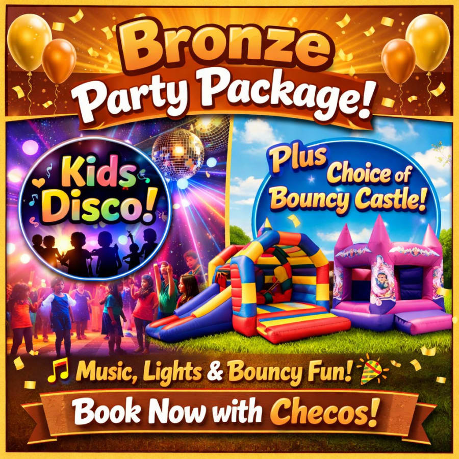 Bronze Party Package – Kids Disco & Bouncy Castle Hire (Ages 3–10) 🎉🏰 Our Bronze Party Package is one of our most popular options for younger children and is perfect for birthday parties, school events and celebrations for ages 3 to 10 years. This exciting 2-hour kids party package combines a professional children’s disco with a choice of bouncy castle, creating the perfect mix of music, games and bouncing fun. The party includes a young, experienced children’s DJ who specialises in kids discos and children’s party entertainment. They will play a great selection of popular children’s music, lead interactive party games, and keep the energy high throughout the event. During the disco, children can take part in fun party games with prizes supplied, helping everyone get involved and enjoy the celebration. We also provide glow sticks for all the children, giving the party a colourful mini disco atmosphere as they dance along to their favourite songs. Alongside the disco, the package includes a choice of bouncy castle, allowing children to enjoy hours of active fun while taking breaks from the dance floor. This package is ideal if you are looking for kids disco hire with a bouncy castle, providing a complete children’s party entertainment package in one simple booking. Package includes: ✔ 2-hour kids disco with young experienced children’s DJ ✔ Children’s music and interactive party games ✔ Prizes supplied for games ✔ Glow sticks for all party guests ✔ Choice of bouncy castle hire ✔ Perfect entertainment for children aged 3–10 Our Bronze Party Package is perfect for anyone searching for kids disco hire, children’s party entertainment or bouncy castle hire for birthdays. It provides everything needed for a fun, stress-free and memorable children’s party. 🎈 Book the Bronze Party Package today with Checos Bouncy Castle Hire and let us bring the party to you!