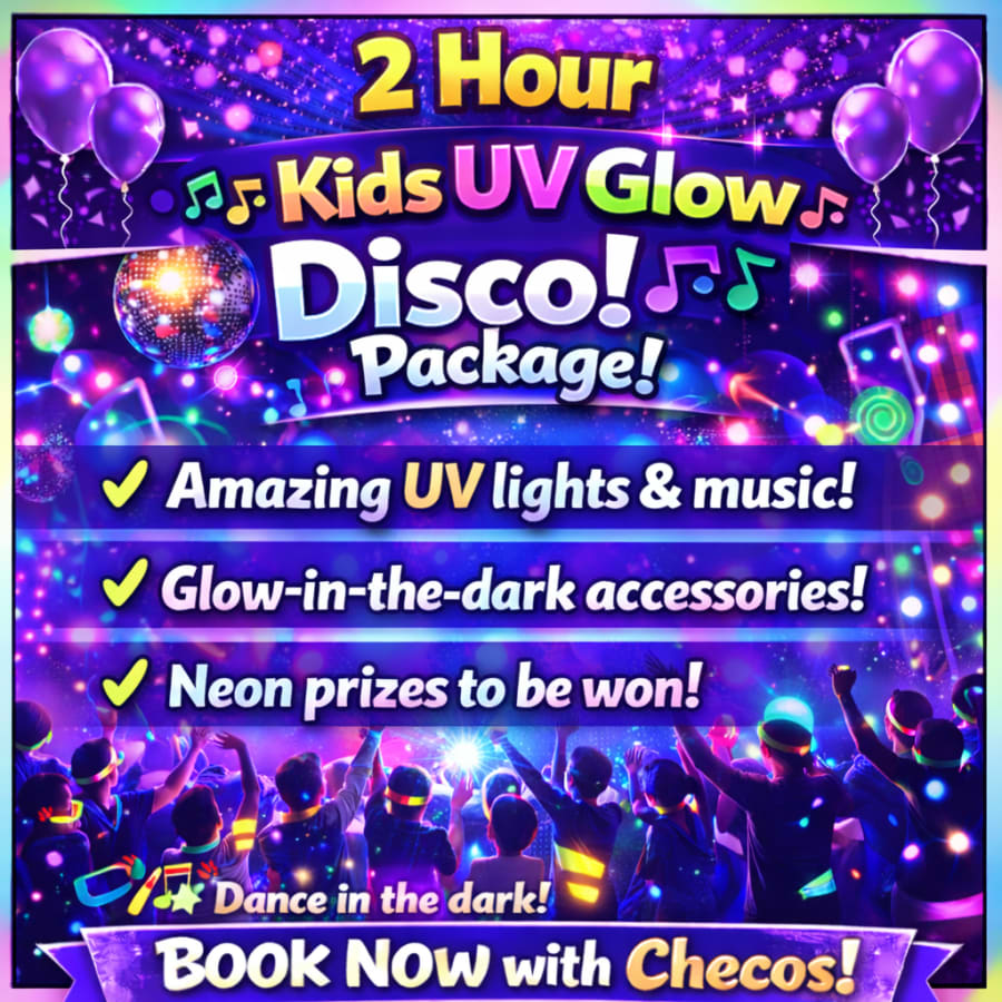 🎈 Book your Kids UV Glow Disco Party Package with Checos today and create a glowing party your child will never forget!