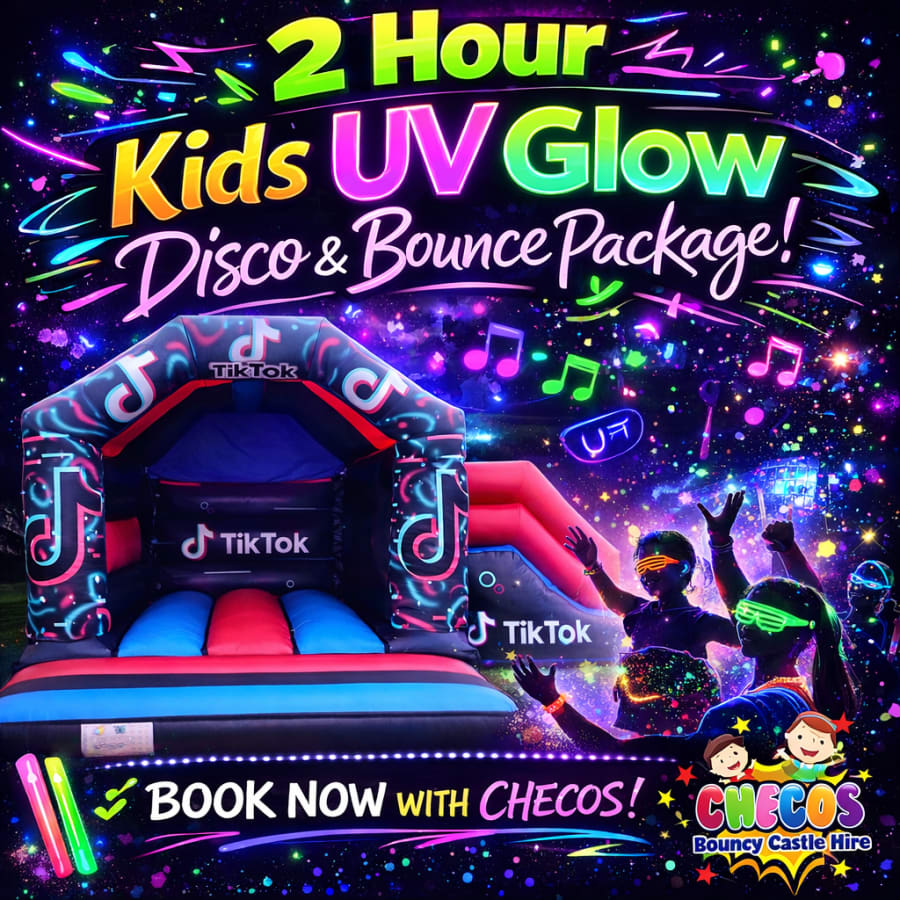 TikTok Bouncy Castle Disco Party Package – UV Glow Kids Party (Ages 4–12) 🎉🏰🎧 Looking for an unforgettable TikTok themed party with a bouncy castle and disco? Our TikTok Bouncy Castle Disco Package is one of the most exciting children’s party entertainment packages, combining a TikTok bouncy castle, a fun kids disco, and a full UV glow party experience. This package is perfect for birthday parties, school events and celebrations, giving children the chance to bounce, dance and glow while enjoying a high-energy party atmosphere. The party includes a kids disco hosted by an experienced children’s DJ who specialises in kids party entertainment and disco hire. The DJ plays a mix of popular children’s songs, TikTok trending music and party favourites, keeping everyone dancing and involved. Children will also take part in interactive disco games, with prizes supplied for the winners, helping keep the party exciting from start to finish. Alongside the disco fun, children can enjoy the amazing TikTok themed bouncy castle, which is always a huge hit at TikTok birthday parties and social media themed celebrations. To add even more excitement, the package also includes UV glow effects, glow sticks for the children, and UV face and body paint, creating an amazing glowing party atmosphere under the disco lights. Package Includes ✔ TikTok themed combo bouncy castle ✔ Kids disco with young experienced children’s DJ ✔ Popular children’s and TikTok music ✔ Fun disco games and competitions ✔ Prizes supplied for game winners ✔ Glow sticks for all party guests ✔ UV glow lights and UV paint ✔ Perfect for children’s birthday parties and celebrations This package is ideal if you are searching for TikTok bouncy castle hire, kids disco hire, UV glow disco parties or children’s party entertainment. 🎈 Book the TikTok Bouncy Castle Disco Package today with Checos and create a party your child will never forget!