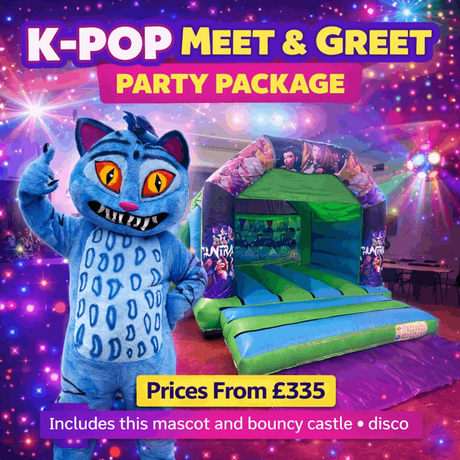 Looking for the best K-Pop party package in Fife, Stirling, West Lothian or Edinburgh? At Checos, we bring the ultimate K-Pop meet & greet party experience to your venue, combining a mascot appearance, themed bouncy castle hire, and full disco setup all in one exciting package.